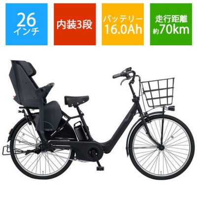 スペック・仕様 | ●品名:ギュット・アニーズ・DX ●品番:BE-ELAD033 ●寸法:全長1,785mm×全幅580mm ●ハンドル高さ:995-1,040mm ●サドル高さ:735-860mm ●タイヤ:20×2.125 HE ●軸間距離:1,235mm ●総車両質量(バッテリーを含む):34.4kg ●フレーム:U形 ●ハンドルバー:アップ ●バスケット:標準装備 ●リフレクター:バッテリーライト部・後どろよけ・前後車輪・ペダルに取り付け ●スタンド:両立スタンド ●リヤキャリヤ:標準装備(クラス27) ●チャイルドシート(後用) 質量:5.0kg ●補助速度範囲:24km/h未満 ●充電1回の走行距離(標準パターン):約50km※(アシストモード:「パワー」使用時) ●モーター形式:直流ブラシレスモーター ●定格出力:250W ●補助力制御方式:踏力比例制御 - 磁歪式 【バッテリー】 ●品番 NKY580B02(ブラック) ●種類 リチウムイオンバッテリー ●容量 25.2V-16Ah(28cells) ●質量 約3.1kg ●ワット時定格量:404Wh 【充電器】 ●品番 NKJ075Z ●形式:スタンド型 ●電源:交流100V(50Hz/60Hz) ●充電時間:約4.5時間 ●質量:約1.0kg ●消費電力:約260VA ●待機消費電力:約0.5W ●変速機方式:内装3段シフト ●乗車適応身長:142cm以上(幼児2人同乗の場合は155cm以上) ●許容積載質量(乗員+荷物):95.0kg ●最大総質量(自転車+乗員+荷物):129.4kg |